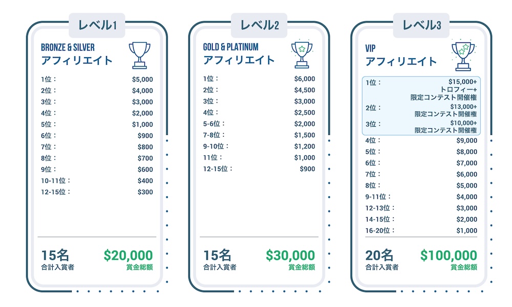 レベル3(VIP):20名 賞金総額$100,000 レベル2(ゴールド、プラチナ):15名 賞金総額$30,000 レベル1(ブロンズ、シルバー):15名 賞金総額$20,000 |