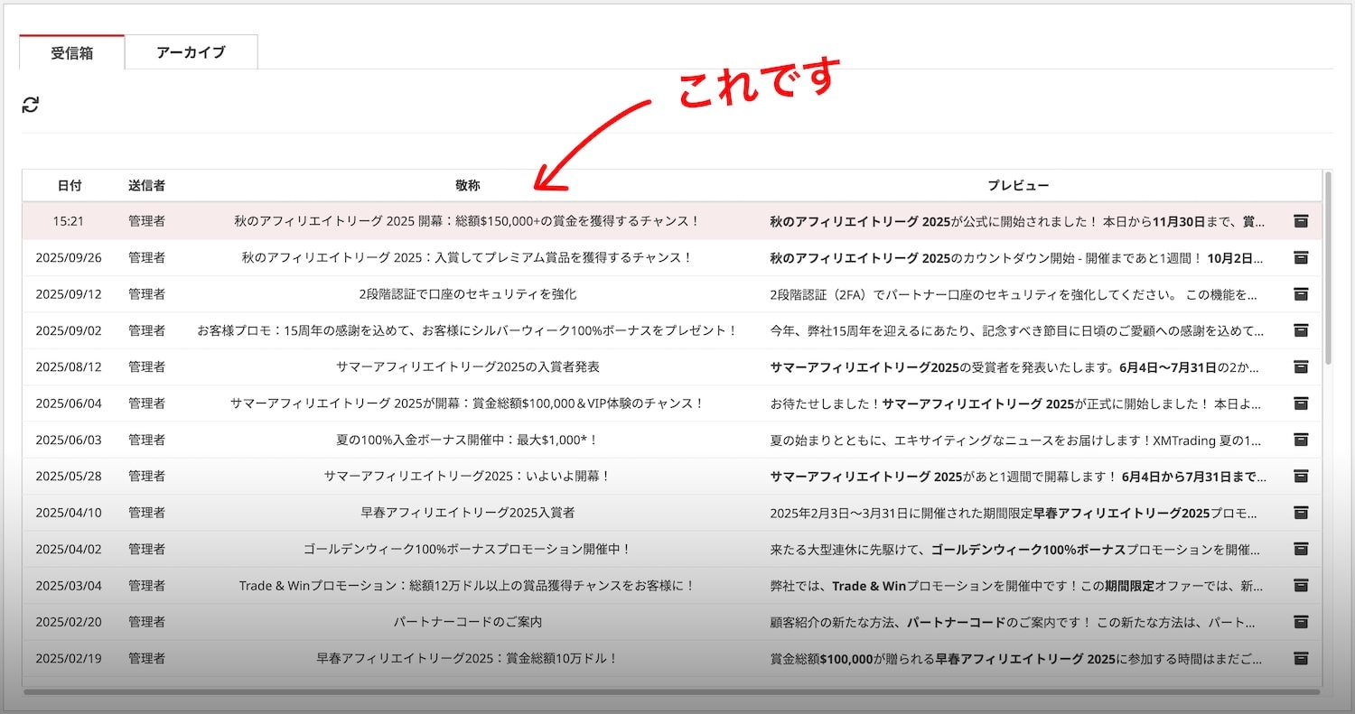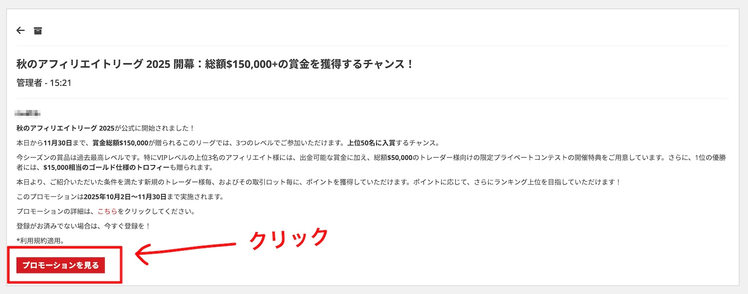 管理画面のおしらせ通知センターの受信箱から、「秋のアフィリエイトリーグ 2025 開幕:総額$150,000+の賞金を獲得するチャンス!」を選択します。