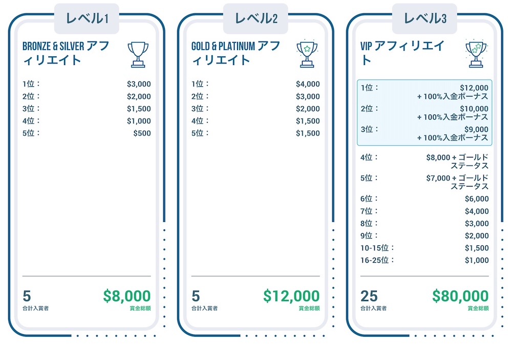 レベル3(VIP):25名 賞金総額$80,000 レベル2(ゴールド、プラチナ):5名 賞金総額$12,000 レベル1(ブロンズ、シルバー):5名 賞金総額$8,000 |