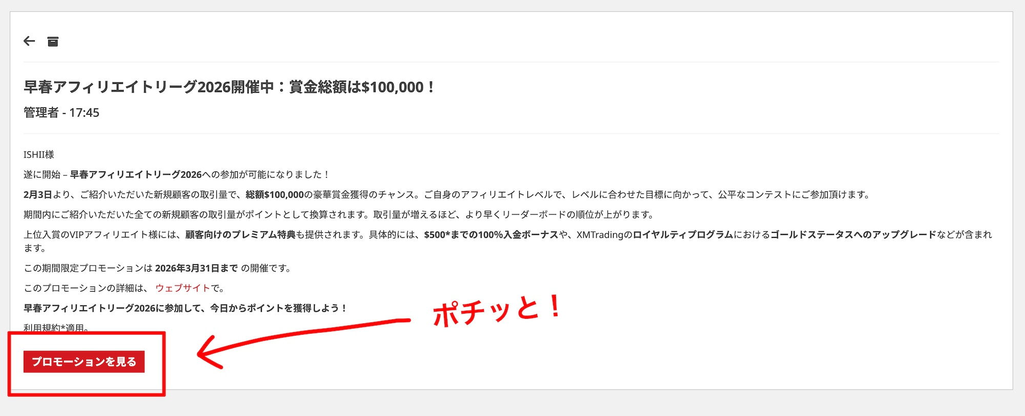 管理画面のおしらせ通知センターの受信箱から、「早春アフィリエイトリーグ2026開催中:賞金総額は$100,000!」を選択します。
