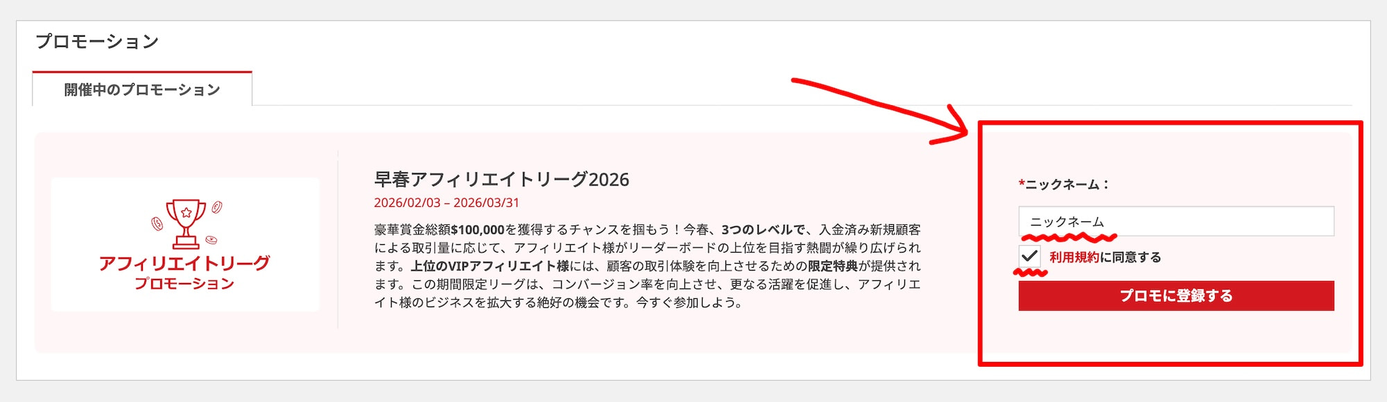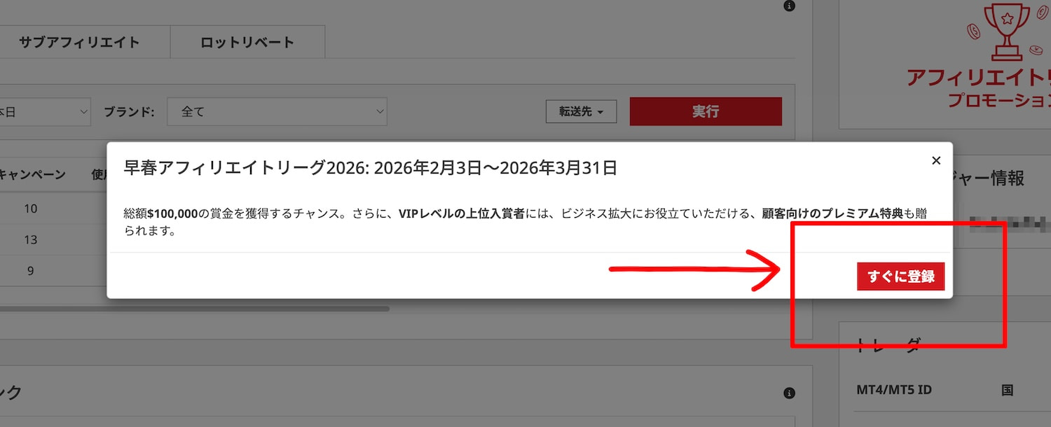 登録するには、XMTradingアフィリエイト管理画面にログインし、プロモーションページに移動して本プロモーションに登録します。